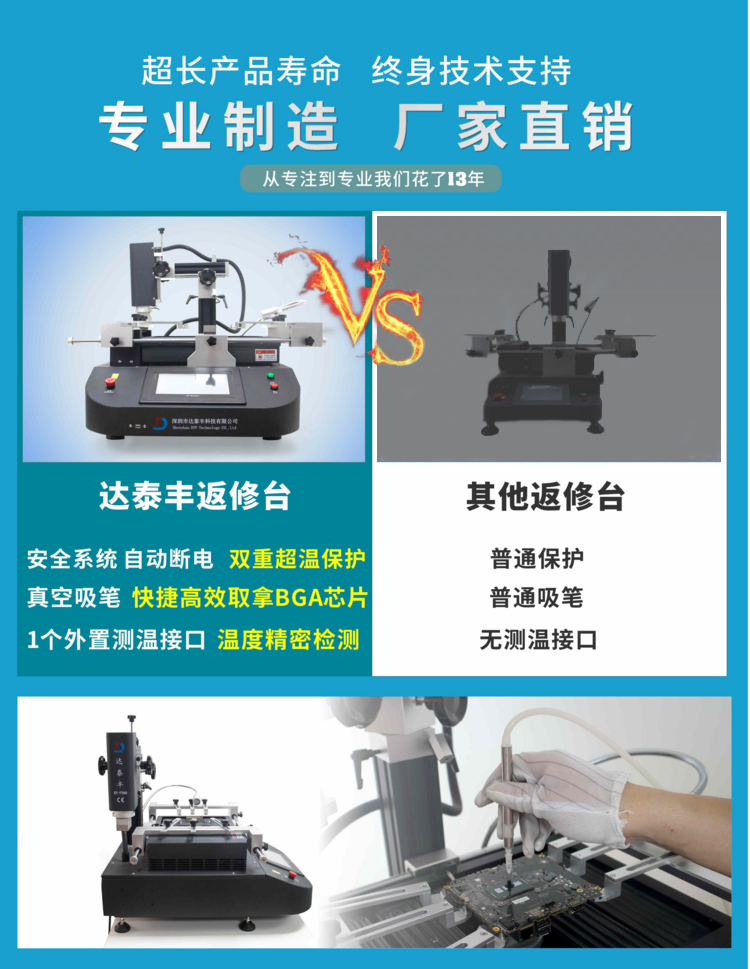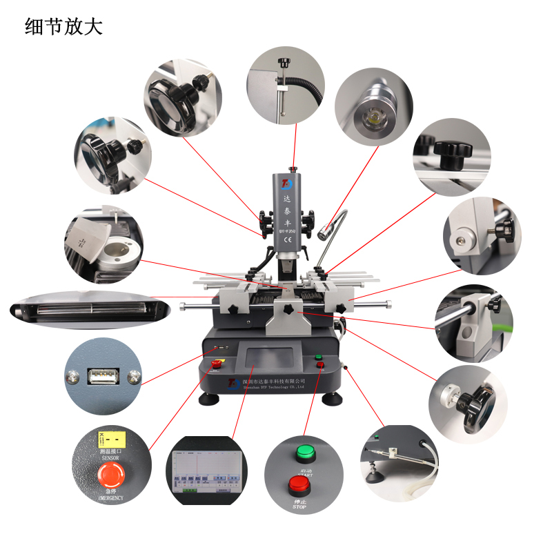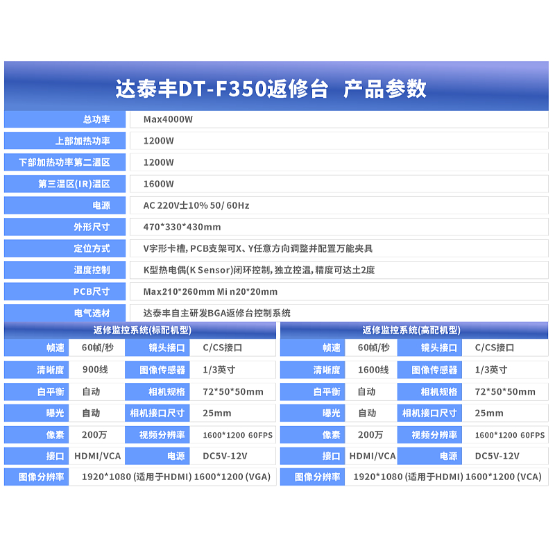 - 上部加熱功率: 1200W(加強(qiáng)版本,可適用于大芯片、大散熱類產(chǎn)品),風(fēng)量可以調(diào)節(jié),最大風(fēng)量25m/s,使用功率由升溫速度與環(huán)境溫度有關(guān),適配200W-1200W使用要求