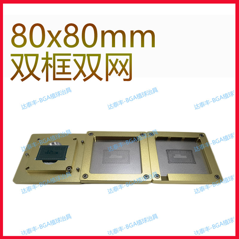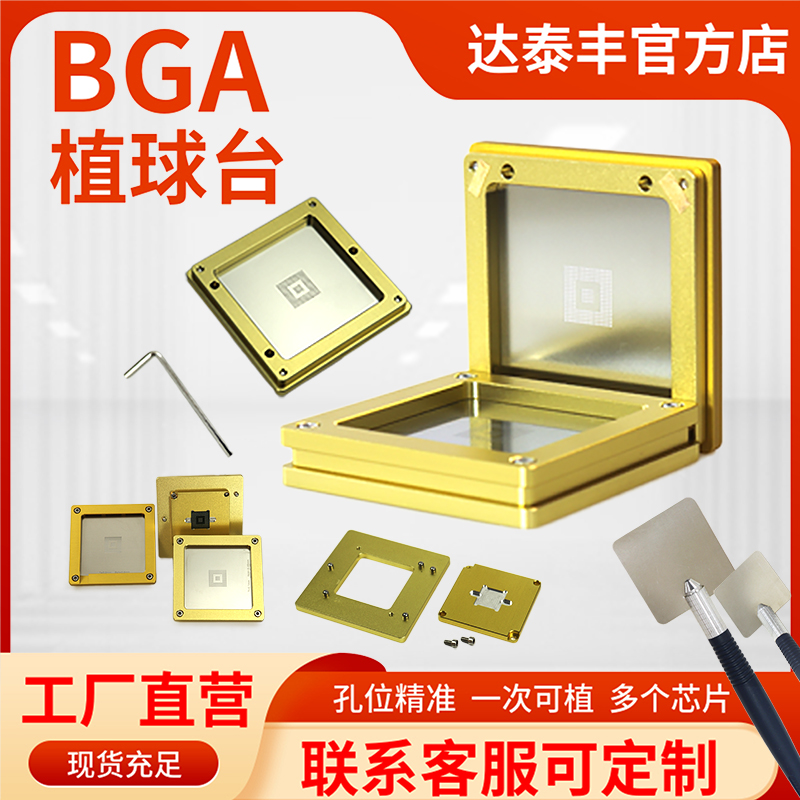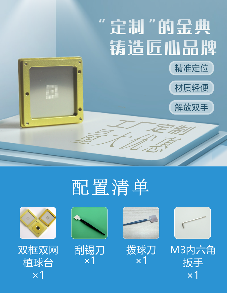 標(biāo)準(zhǔn)套件包括:固定芯片模板一套,印錫膏治具一套(可定制刮錫成球類),植錫球治具一套,上錫刀具一套,下球工具一套。